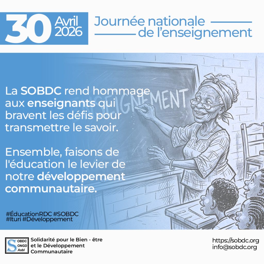 30 avril : Journée nationale de l’enseignement, la SOBDC salue la résilience des enseignants de la RDC et de l’Ituri. Elle réaffirme son engagement pour une éducation inclusive, pilier de la paix et de la reconstruction nationale.
